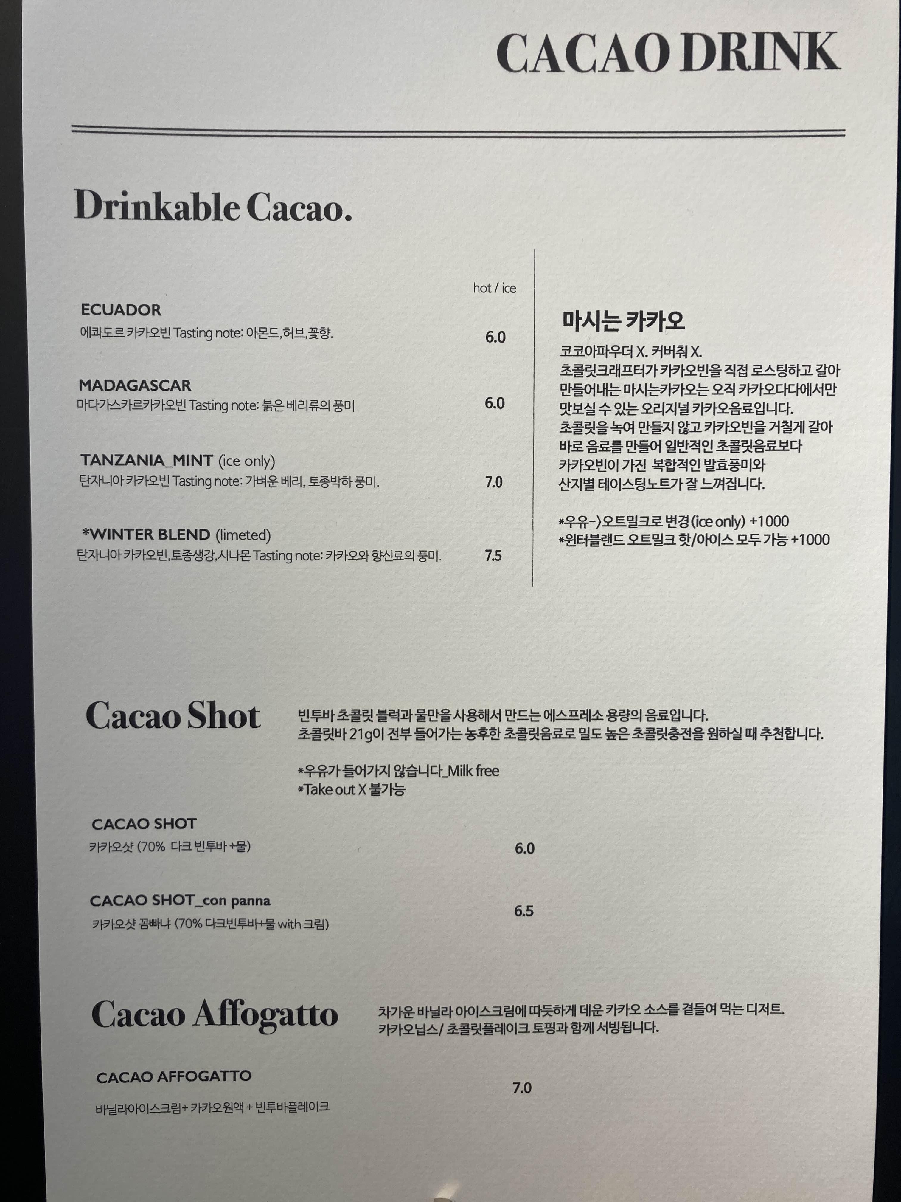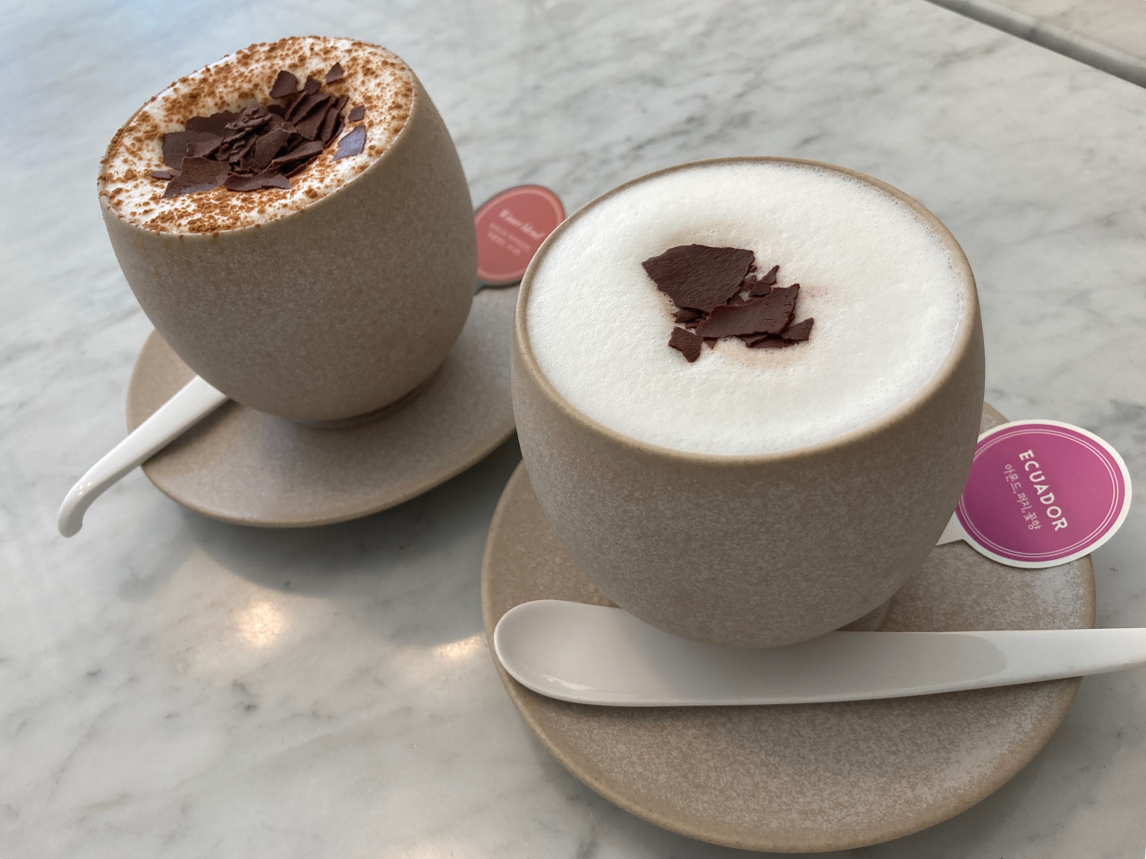 에콰도르는 평범한 듯하면서도 깊고 진했다. 가끔 너무 진해서 머릿속으로 빨려 들어갈 것만 같은 느낌이 들 때마다 우유 거품이 구명보트처럼 나를 구해줬다. 깊고 진한 풍미가 중독적이라 몇 잔이고 계속 마실 수 있을 것 같았다. 윈터 블랜드는 겨울 한정이었다. 새콤하면서도 얼큰한? 이국적인 풍미가 신선했다. 에콰도르도 마찬가지였지만 흔한 핫 초코가 아니라 완전히 새로운 차원의 음료였다. 카페에서 커피가 아니라 이런 카카오 음료를 판다면 앞으로 다시는 커피를 마시지 않을 것이다.